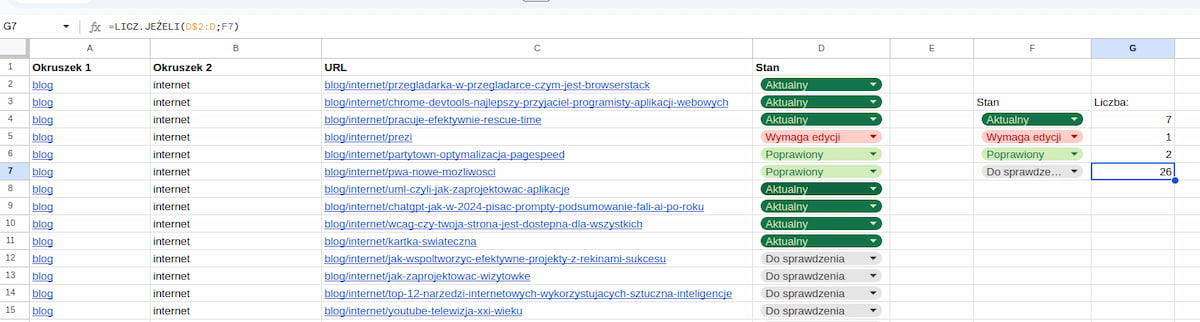 Na przykład - w poprzednim kroku uzyskaliśmy piękny podział strony, uwzględniając hierarchię adresów. Teraz możemy chcieć np. przejrzeć każdy wpis blogowy z kategorii internet - sprawdzić, czy się nie zdezaktualizował. Jak zapanować nad tym procesem?