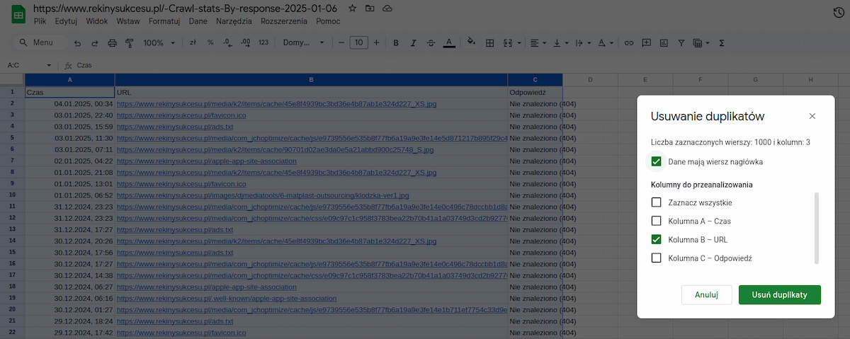 Pokażmy to na przykładzie. Mamy listę stron na naszym serwerze, które napotyka robot Google i otrzymuje błąd 404 (dane pochodzące ze statystyk indeksowania w GSC). Chcemy je wszystkie sprawdzić, ale wiele z nich się powtarza. Jak więc można uprościć sobie życie?