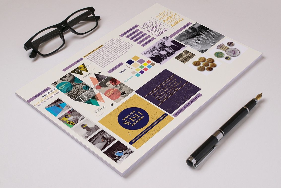 Gdy wybierzemy koncepcje, które nam odpowiadają musimy je w jakiś sposób przedstawić zleceniodawcy. Tutaj z pomocą przychodzą moodboardy, czyli tablice inspiracji dotyczące konkretnej koncepcji. Umieść na jednej tablicy wszystko co najlepiej odwzorowuje Twoją koncepcję: fonty, kolory, zdjęcia, grafiki itp. Nie ma dokładnych wytycznych jak tworzyć moodboardy, dlatego sam jako projektant musisz zdecydować co umieścić na tablicy, aby klient w pełni zrozumiał Twój tok rozumowania.