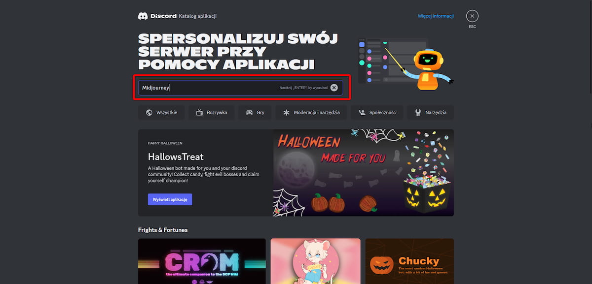 - Po uruchomieniu aplikacji Discord wystarczy, że w lewym panelu klikniemy ikonę z kompasem i w “wyróżnionych społecznościach” powinna pojawić nam się społeczność MidJourney. Jeśli jednak nie jest ona widoczna w wyróżnionych społecznościach, możemy ją znaleźć, wpisując MidJourney w pasku wyszukiwarki.