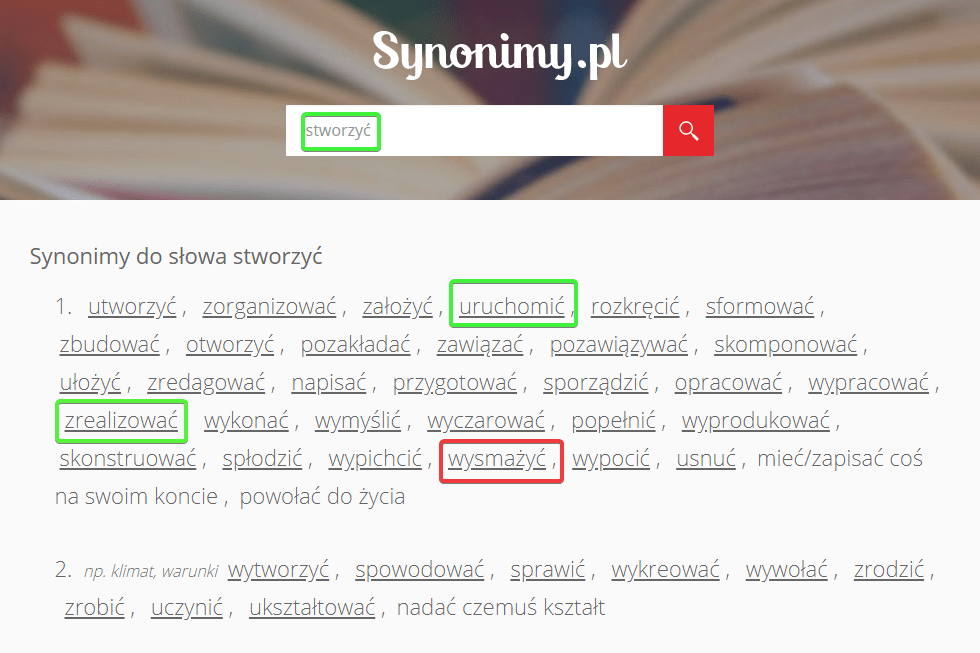 Unikaj powtarzania słów w bliskim ich sąsiedztwie. Jeśli masz problem ze znalezieniem wyrazów bliskoznacznych, skorzystaj ze słownika synonimów. Dzięki temu nie musisz kolejny raz powtarzać informacji o stworzeniu strony czy uciekać się do błędnego jej popełnienia. Napisz, że ją zrealizowałeś lub uruchomiłeś.