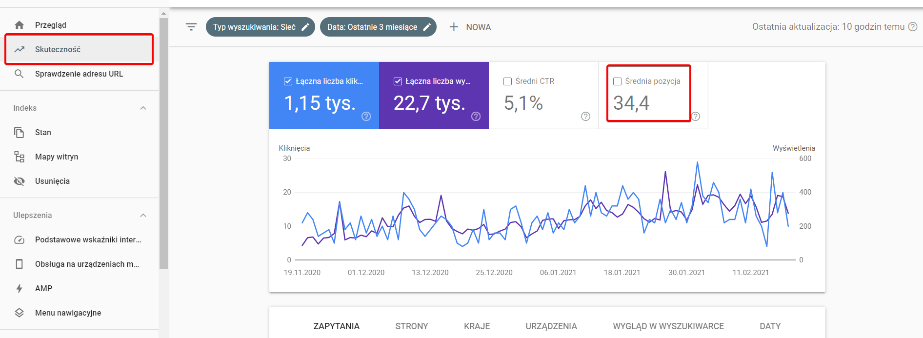 Aby sprawdzić pozycje w wynikach wyszukiwania, przejdźmy do zakładki Skuteczność. Naszym oczom ukaże się wykres z podstawowymi informacji o kliknięciach i wyświetleniach dla całej witryny:
